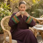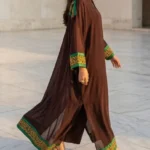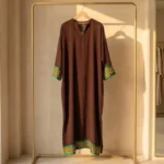 Detailed calligraphy on chocolate brown georgette kaftan.